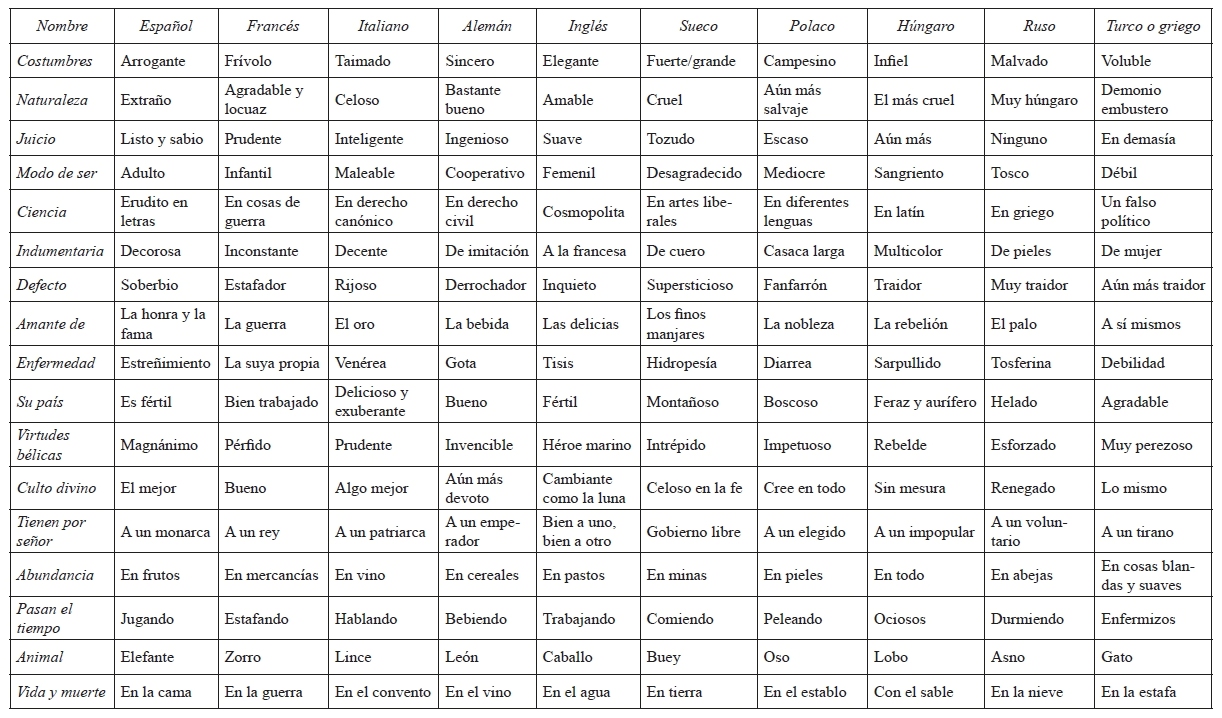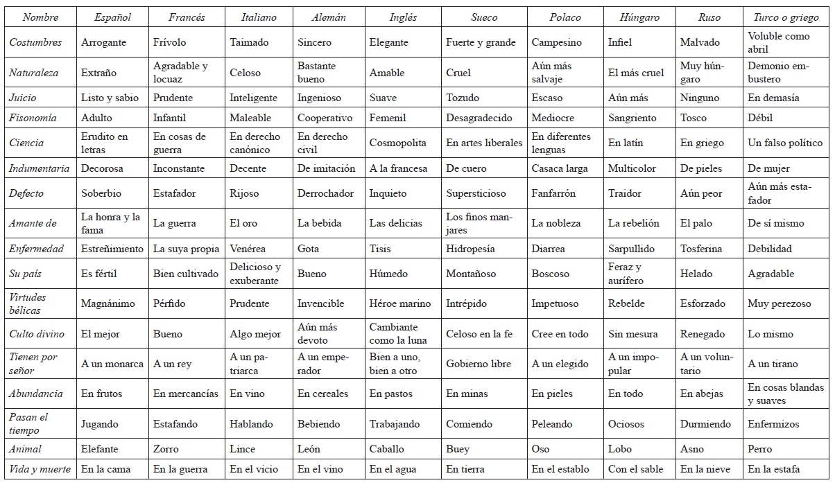 Ambas obras ofrecen una clasificación de los representantes «típicos» de diez naciones europeas alineados horizontalmente siguiendo una dirección aproximada de oeste a este y de sur a norte. La clasificación tiene lugar con arreglo a diecisiete conceptos o cualidades alineados verticalmente. Cada uno de estos tipos –español, francés, italiano, alemán, inglés, sueco, polaco, húngaro, ruso y turco o griego (sic, es decir, identificando a ambos en uno)– aparece representado por una imagen con una indumentaria característica.5 Ello da lugar a una doble estructura, ya que las descripciones se pueden leer en sentido horizontal/sintagmático o vertical/paradigmático. Leídas de manera horizontal ofrecen la perspectiva comparatística típica de la literatura etnográfica, lo cual se refleja a veces en la gramática, con formas comparativas o superlativas. Por ejemplo: la naturaleza del sueco es calificada de «cruel»; la del polaco, de «aún más salvaje»; y la del ruso, «la más cruel». El culto divino del español es «el mejor»; el del francés, «bueno»; el del italiano, «algo mejor»; y el del alemán, «el más devoto». En cambio, la lectura vertical ofrece el retrato completo de una nación y exige un mayor esfuerzo de combinación de conceptos, que a veces pueden resultar contradictorios, o simplemente inconexos; sobre todo cuando aparece una forma comparativa o superlativa cuyo término de comparación no se conoce si no se consulta la casilla anterior en sentido horizontal.