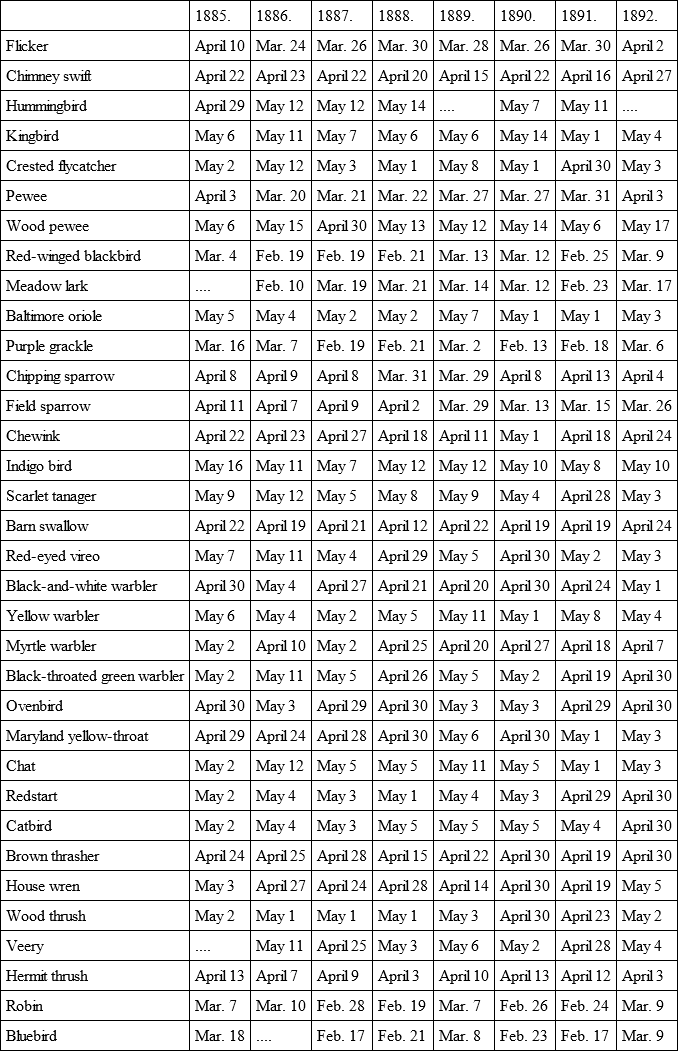 Some ten or more years ago several enthusiastic ornithologists living in the neighborhood of Philadelphia began keeping records of the times of arrival of the different species of birds, and at the same time noted the conditions of temperature in relation to the abundance of individuals. After several years of these observations they were able to see clearly that these bird waves were directly related to the waves of rising temperature marking the advent of warm spells of weather. One of the most significant facts deduced from these observations was the remarkable regularity in the first appearance of certain species. For example, the Baltimore oriole in eight years of observation never arrived before the 1st of May, and only twice later than the 4th – viz., once on the fifth and once on the 7th. The list on the opposite page shows the date of first arrivals extending over a period of eight years, from 1885 to 1892.10