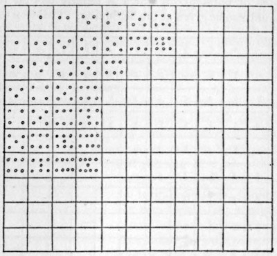 When a child has learned to count through the use of such objects as I have mentioned he may be taught what is called the addition table. This table can be learned by heart easily enough, but when we reach the multiplication table we come upon one of the tortures of childhood. Would it not be simpler and easier to make the children construct these tables, instead of making them learn them?