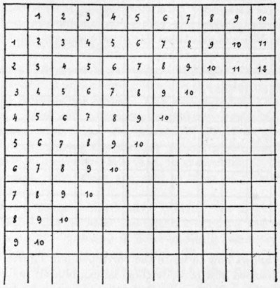 Let us first take the addition table, and suppose that we trace ten columns on suitably ruled paper, at the top of which we write the first ten numbers, for example, and then write them again at the beginning of a certain number of horizontal lines (Fig. 1). Let us suppose, too, that we have a box divided into compartments arranged like the squares in our table, into which we put heaps of balls, beans, or dice corresponding to the numbers indicated in the table. The child will take, for example, two balls from one compartment and three from another, will put them together and place his five balls in the case corresponding with the point where the lines of two and three will meet, and will thus gradually accustom himself to the idea that two added to three are equal to five, four and two to six, etc., before he knows how to write the corresponding figures. As soon as he has learned how to write them he can himself make the table with figures (Fig. 2), showing that one and one make two, one and three four, etc.
