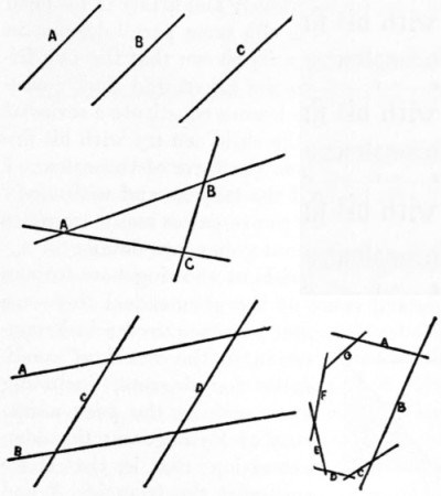 We need not stop with arithmetic, but may go on and give the child a little geometry. To accomplish this we should give him the idea of geometrical objects, and to some extent their nomenclature, and this can be done without causing fatigue. To accomplish this he should be taught to draw, however rudely. He can begin with straight lines, of which he soon learns the properties; then, when he has drawn several lines side by side, he will learn that they are parallels and will never meet. He will learn, too, after he has drawn three intersecting lines, that the figure within them is called a triangle, that the figure formed by two parallel lines meeting two other parallels is a parallelogram, and he can go on to make and learn about polygons, etc (Fig. 3). All this nomenclature will get into his head without giving abstract definitions, but in such a way that when he sees a geometrical object of definite form he will recognize it at once and give it the name that belongs to it.