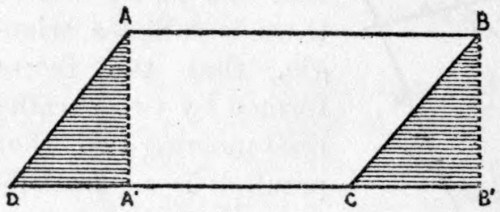 In the practical matter of the measurement of areas we convey immediate comprehension as to many figures without special effort, provided we do not present the demonstration in professional style, limiting ourselves to making the pupil comprehend or feel things so clearly and definitely that it shall be equivalent, as to the satisfaction of his mind, to an absolutely rigorous demonstration. At any rate, he will be better provided for the future than by rigorous demonstrations that he does not understand. Taking the parallelogram, for example, let us suppose a figure made like Fig. 4, and we saw through it along the lines A A' and B C. It does not need a very great effort of attention to recognize, experimentally if need be, that the two triangles A A' D and B B' C may be placed one upon the other and are identical. If, from the figure thus formed, we take away the right-hand triangle the parallelogram will remain; if we take away the other triangle a rectangle will be left, or a peculiar parallelogram, of which also we give the idea to the child as a figure in which the angles are formed by straight lines perpendicular to one another. Here, then, the child gains the notion of the equivalence of a parallelogram and a rectangle of the same base and height; and this notion, obtained by cutting up a piece of board or pasteboard, he will carry so seriously and firmly in his head that he will never lose it. By cutting the same parallelogram in two, along a diagonal A C, it may be easily shown that the two triangles can be placed exactly one upon the other, and that, consequently, they have equal areas. These lessons constitute a series of classical theorems in geometry which the child can try with his fingers and learn without even giving them the form of theorems. I might show the same as to the area of the trapeze and with many other theorems, but my purpose is only to present as many examples as will make my idea understood, without going into details.