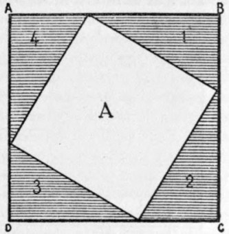 It is easy to see in the other figure, which is formed after the same measures as its alternate, that the triangles 1, 2, 3, 4 can be arranged so as to occupy the positions 1', 2', 3', 4' in such way as to leave in the main square two smaller squares constructed on the sides of one of the right-angled triangles. It follows that the square A is equivalent to the sum of the squares B and C. The theorem thus becomes a kind of intuition, a thing evidently indisputable.