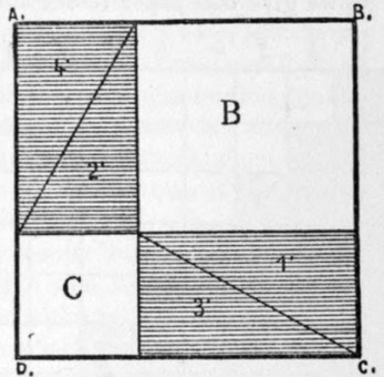 Yet I can not leave this subject without showing how we can make a very child understand some of the geometrical theorems that have acquired a bad reputation in the world of candidates for degrees, including even such as the pons asinorum of Pythagoras; the demonstration, that is, that if we construct the triangles B and C on the sides of a right-angled triangle, their sum will be equal to the square A constructed on the hypotenuse. The usual demonstration of this theorem is not very complicated, but there is something tiresome, artificial, and hard in it. The demonstration I propose is almost intuitive, and the reasoning of it is both simple and rigorous.