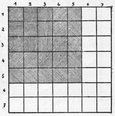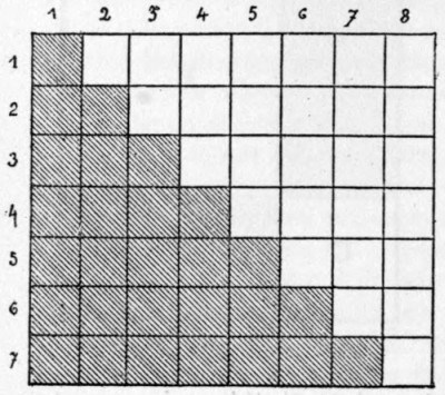 Having given our little one an initiation into the mysteries of arithmetic and geometry, we introduce him to algebra, a branch which passes in the majority of families as the hardest, most complicated, and most abstruse that can be imagined. I do not pretend that algebraic theories enter easily into the child's delicate brain; rather the contrary; but I declare that some ideas in algebra can be made comprehensible to children without fatigue. We can, for instance, make them understand, in the way of amusement and without great difficulty, the formula that gives the sum of the first numbers. We take a sheet of paper ruled in squares and shade the first square of the first line, then the first two squares of the second line, the first three of the third, etc. (Fig. 7). The whole number of squares shaded in this manner represents visibly the sum of the first whole numbers up to any one we may choose – to 7 in the figure. If we give this paper to the child and ask him to return it, he will very easily perceive that the figures formed by the white and the black squares are alike. The number sought for will therefore be equal to half the sum of the squares – that is, in the present example