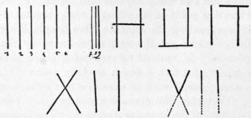 There is no amusement, however puerile it may appear, not even a play of words, that can not be utilized in teaching of this sort. For instance, when your child has learned his addition table, if you put him to a demonstration, assuming to prove to his comrades that six and three make eight, his curiosity will be excited, and you may be very sure that, once his attention has been given to this amusement, he will never forget that six and three make nine and not eight. To make the demonstration, we have only to group the nine match-sticks as in the figure (Fig. 9) below. We might demonstrate in a like way that half of twelve is seven by cutting the Roman numeral XII in two, leaving the upper part visible. Such pleasantries have a pedagogical value, because the paradox is precisely of a kind to attract the attention of the child, and he will always afterward be sure not to fall into the trap.