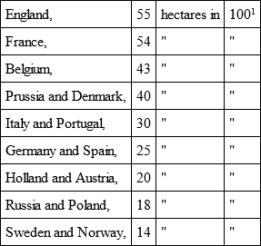 1The estimate for this country is clearly too small. Out of one hundred acres in England, seventy-eight are under cultivation, or in meadow. For the British Islands, the proportion is about sixty-four to one hundred. As to the extent of uncultivated but available land in Prussia, see the Evidence of Mr Banfield before the Committee of the House of Lords on Burdens affecting Land.