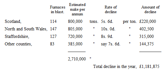 Of this amount, probably fully one-half would be the actual loss sustained by makers and holders during the year. I am content, however, to set it down at £500,000. Something ought to be added for the deterioration of stocks throughout the country, the precise amount of which it is very difficult to ascertain. As, however, there are on hand, in Scotland alone, 350,000 tons of pig-iron, with no prospect of any serious decrease in the quantity, or improvement in price, for some time to come, unless the make is very materially reduced, I may very safely set down in this account an additional £200,000 for the depreciation throughout the kingdom – making thus a total loss upon iron of £700,000.