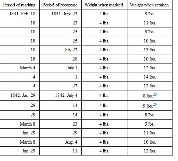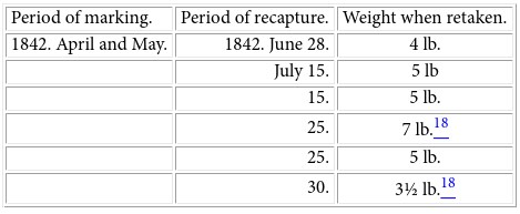 In January 1842, he repeated the same process of marking 4 lb. grilse which had spawned, and were therefore about to seek the sea; but, instead of placing the wire in the back fin, he this year fixed it in the upper lobe of the tail, or caudal fin. On their return from the sea, he caught many of these quondam grilse converted into salmon as before. The following lists will serve to illustrate the rate of growth:—