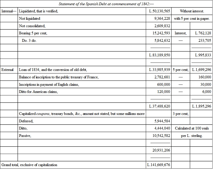 This revision of her fiscal system, and reconstruction, on fair and reciprocal conditions, of her commercial code, are questions of far deeper import—and they are of vital import—to Spain than to this empire. Look at the following statement of her gigantic debt, upon which, beyond some three or four hundred thousand pounds annually, for the present, on the capitalized coupons of over-due interest accruing on the conversion and consolidation operation of 1834, the Toreno abomination, not one sueldo of interest is now paying, has been paid for years, or can be paid for years to come, and then only as industry furnishes the means by extended trade, and more abundant customhouse revenues, resulting from an improved tariff.