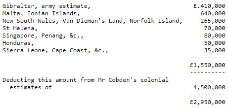 Returning westward, we have the Bay of Honduras with a military establishment, including reserve as per Cobden, expending about £.50,000, which ranges for the far greater part within the category of the cost attending foreign trade. Then, on the West African slave-trading coast, we have Sierra Leone, with a military expenditure, actual and contingent, of about £.25,000. There are the Cape Coast Castle, Acera, Fernando Po, and other small African settlements besides, which cannot cost less, in military occupation, than some few thousands a-year, say only £.10,000, all for foreign trade, since colonization and production are nil; and with Sierra Leone, they are only kept, or were established, for the purpose of suppressing the trade in slaves, and promoting a foreign trade in that quarter of Africa. Coming to Europe we have Heligoland, a rock in the North Sea, which, as only costing something more than £.1000 per annum on foreign trade account, we may leave out of question. Now, without pretending on the present occasion to make up and offer an approximate estimate of the proportion of army expenditure charged against the colonies by Mr Cobden, which should be set down either to political account, as arising from the possession and maintenance of outposts necessary for defensive or defensively aggressive purposes, in case of, or for the prevention of foreign war, or for the protection and encouragement of foreign trade, in which a right large portion of the military expenditure for Jamaica, Nova Scotia, the Bahamas, Bermuda, &c., may be regarded, we shall content ourselves with reducing his wholesale estimate of colonial army charge by the materials antecedently furnished. The reductions will stand thus, premising that in respect of Singapore, Penang, and Malacca, we have not the means of ascertaining what proportion of the charge falls upon the national treasury, as part is borne by the East India Company. Of one fact there can, however, be no doubt; namely, that nearly the whole of that charge is incurred for the support and maintenance of foreign trade, just in or about the same degree as the charges for Gibraltar.