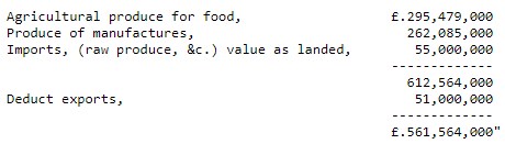 "The yearly consumption of the population of Great Britain and Ireland for food, clothing, and lodging, (we give the round numbers only):—