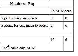 (Savile, when I showed it to him, said the receipt was the only one of the kind he had seen in the course of a long experience.) Very much surprised was the old lady, of whom I made the purchase in my capacity of stage-manager, at so uncommon a customer in her line of business; and when, after enjoying her mystification for some time, I let her into the secret, so delighted was she at the notion, that she gave me sundry hints as to the management of the female toilet, and offered to get made up for me any dresses that might be required. So I introduced Leicester and his fellow-heroines to my friend Mrs Moore, and by the joint exertions of their own tastes and her experience, they became possessed of some very tolerable costumes. There was a good deal of fun going on, I fancy, in fitting and measuring, in her back parlour; for there was a daughter, or a niece, or something of the sort, who cut out the dresses with the prettiest hands in the world, as Leicester declared; but I was too busy with carpenters, painters, and other assistants, to pay more than a flying visit to the ladies' department.