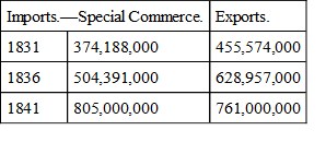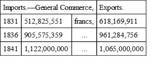 The imports, therefore, for consumption, that is, duty paid upon and consumed, had multiplied twofold in the ten years; and the exports of the products of the soil and manufactures, at the rate of 300 millions of francs or twelve millions sterling.