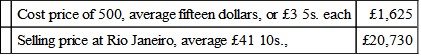 On the east coast negroes are paid for in money or coarse cottons, at the rate of eighteen dollars for men, and twelve for boys. At Rio Janeiro their value may be estimated at £52 for men, £41, 10s. for women, and £31 for boys. Thus, on a cargo of 500, at the mean price the profit will exceed £19,000—
