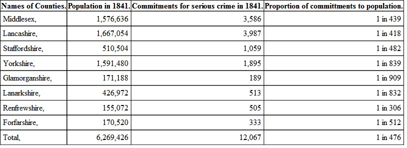 Table showing the number of committments for serious crimes, and population, in the year 1841, in the under-mentioned counties of Great Britain;—