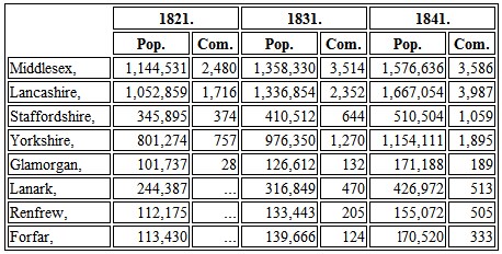 Table, showing the comparative population, and committals for serious crime, in the under-mentioned counties, in the years 1821, 1831, and 1841.