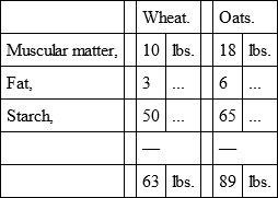 But Professor Johnston, in the recent edition of his Elements,28 tells us, that, from experiments made in the laboratory of the Agricultural Chemistry Association of Scotland, it turns out that oats are far richer in all the three things above named than the best wheat flour grown in any part of England – that they contain eighteen or twenty per cent of that which forms muscle, five to eight of fat, and sixty-five of starch. The account, therefore, between shelled oats (groats) and fine wheaten flour stands thus. One hundred pounds of each contain —