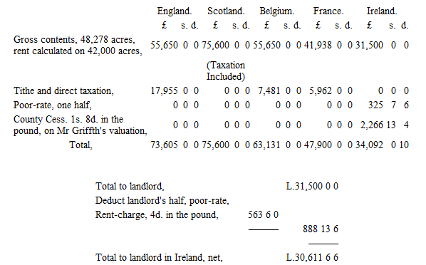 According to the Government survey, Leitrim contains 375,992 acres; the valuation, including the houses of the gentry and shopkeepers, is L.120,000: add 25 per cent, or L.30,000, and we have the fair rent at L.150,000, or under eight shillings an acre.
