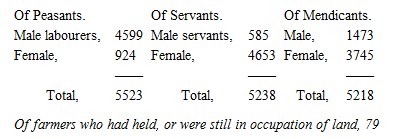 Thus we see, that the number of servants and vagrants requiring relief, amounted to within three hundred of the numbers of the agricultural labourers, and that the number of those connected with the possession of land, and who had sought relief on account of termination of leases, non-payment of rent, expulsion because they were tenants-at-will, or temporary distress, amounted to the incredibly small number of seventy-nine.