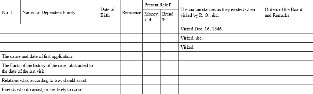 The Report Book1 was briefly commented upon in a former article. Its size should be ample – for it is presumed that each page will record the results of many visits, and be referred to on each occasion that the pauper appears before the Board. The lapse of time between the first entry and the last, may be seven or even ten years.