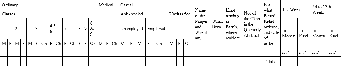 It is possible that a union maybe found in which the number of poor are so few, as to allow of the four orders of poor – the Ordinary, the Medical, the Casual, and the Unclassified – to be contained in one book; but in general it would be necessary to separate them and to appropriate a book to each order; and there are parishes so large, and in which certain classes of poor abound, as to require separate books for those particular cases.