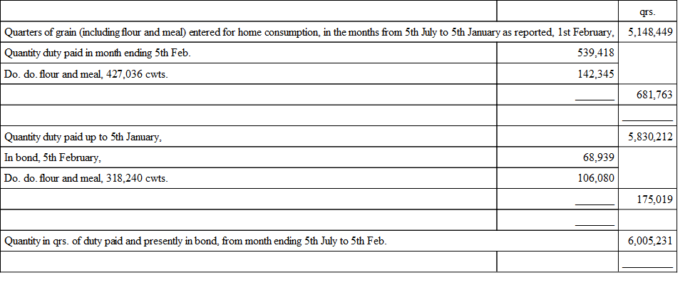 Table showing the quantity of grain, including flour and meal, entered for home consumption, from 5th July 1846, to 5th February 1847, from the London Gazette official returns:—