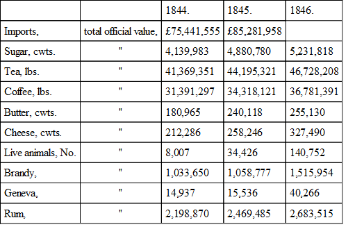 "This process cannot go on any longer. We have now no accumulations to eat into, and must, consequently, pay for what we use. Concurrently, therefore, with our importations of corn and other provisions, (which are now going on at a much greater rate, and at much higher prices than in 1846,) and just in proportion as they beget a demand for our manufactures, we must have importations of raw material. Large purchases of hemp and flax are alleged to have been made in the north of Europe, for spring shipment, and cotton from the United States is only delayed by the want of ships. Wool from Spain, and the Mediterranean, saltpetre, oil-seeds, &c., from India, and a host of minor articles, have also been kept back by the same cause, and will pour in upon us to make up our deficiencies directly any relaxation shall take place (if such could be foreseen) of the universal influx of grain. In this way, just as one cause of demand diminishes the other will increase, and the balance will be kept up against us for a period to which at present it is impossible to fix a limit.