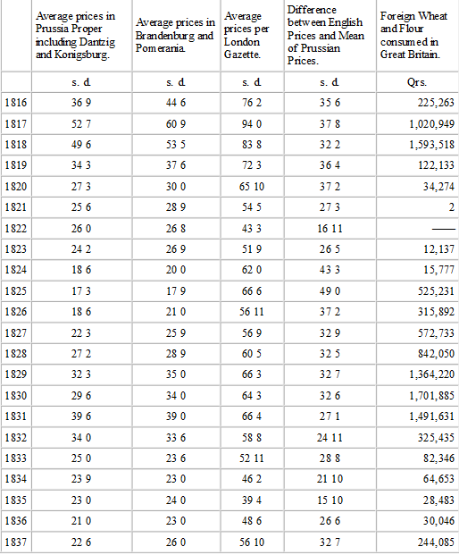 Table of Average Prices of Wheat in Prussia and in England, from 1816 to 1837.