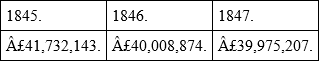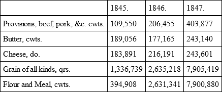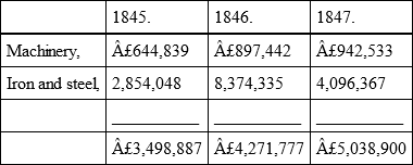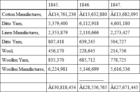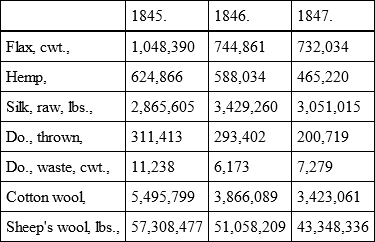 The decline upon these staple commodities of export is so obvious as to need no remark. There is also a falling off, as between 1845 and 1847, in the following exported articles: – Butter, candles, coals, earthenware, glass, leather, copper and brass, lead, tin-plates, soap, and refined sugar. The rise, on the contrary, is upon cheese, fish, hardwares, machinery, iron and steel, unwrought tin, salt, and silk manufactures; of which two items certainly important.