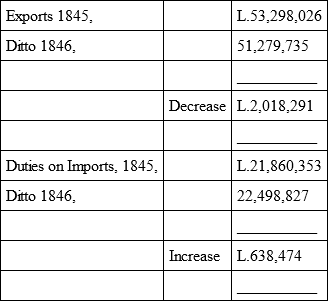 The avowed object of these reductions, which have curtailed our revenue, and saddled us permanently with a war tax, was to increase the amount of our exportations in exchange. If this effect has not been produced, or if there is no likelihood of its being produced within a reasonable period of time, then we are entitled to conclude, from the arguments of the free-traders themselves, that the experiment has been a total failure. We must never lose sight of the fact, that the sure test of free-trade, for which object we have sacrificed our revenue, is augmented export. Let us see how far this branch of the scheme has succeeded. We shall take the exports and imports for the years 1845 and 1846, which will afford a sufficient indication of the manner in which the new tariff is likely to work.