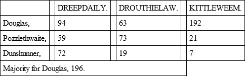 I pass over the proceedings at the poll. From a very early hour it became perfectly evident that my chance was utterly gone; and, indeed, had it been possible, I should have left Dreepdaily before the close. At four o'clock the numbers stood thus: —