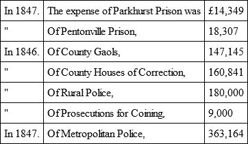 The whole but a few items, yet amounting to a million sterling annually. In this we observe the Millbank Penitentiary, an immense establishment, Newgate, the Compter, and the various places of detention in the city, are not included; and there is no notice of the expenses of building, which in the instance of the Penitentiary alone amounted to a million.
