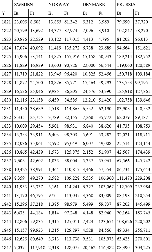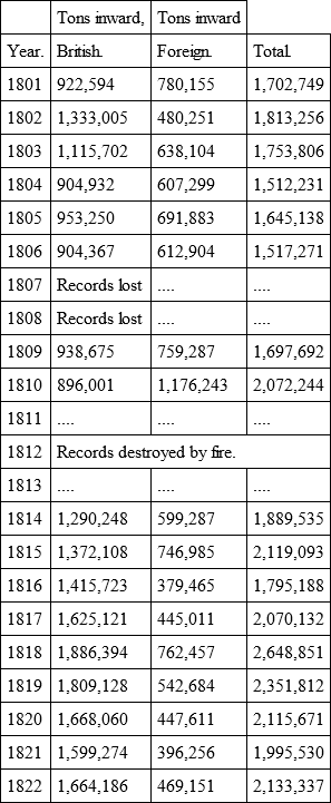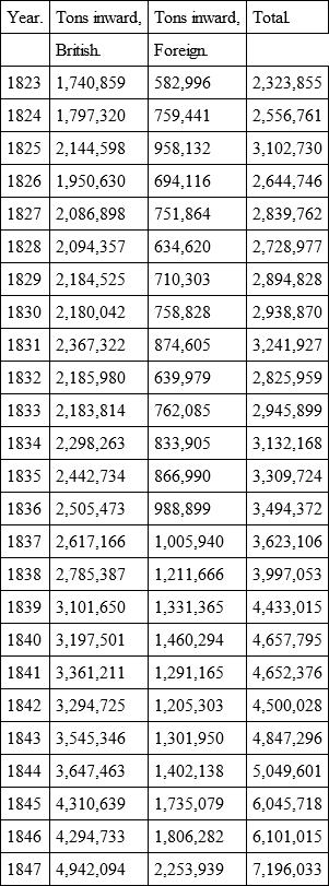 To prove that these remarks are not made at random, but that the Navigation Laws really are the foundation of the maritime greatness of England, and that, when they are repealed, it must of necessity languish and ultimately expire, we subjoin three tables: one showing the progress of British as compared with foreign shipping, from 1801 to 1823, when the protection of the Navigation Laws was first infringed upon by the adoption of the reciprocity system with the Baltic powers; and another showing the comparative progress of our foreign and home shipping with Sweden, Norway, Denmark, and Prussia, the countries with whom reciprocity treaties were first concluded, from 1823 to the end of 1847, when the reciprocity system had been a quarter of a century in operation.