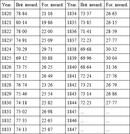 The manner in which foreign shipping has encroached upon British, since the reciprocity system began in 1823, is clearly proved by the centesimal proportions of each, published by Mr Porter, from 1820 to 1844, both inclusive.