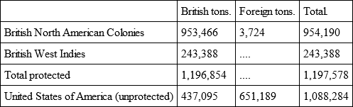 Observe, too, the decisive proof which the same return affords of the vast superiority, in every point of view, of our colonial trade to our foreign, even in the hands of our best free-trade customers, the Americans. For while less than 3,000,000 of souls between the West India and North American colonies furnished employment to 1,197,000 tons of British and foreign shipping, of which 1,193,000 was British; twenty millions of Americans in the United States only furnished employment to 1,088,284 tons of shipping, in all of which no more than 437,095 were British! And this is the pet instance of the Free-traders – their favourite cheval de bataille– to demonstrate the great superiority of free and foreign over protected and colonial trade!