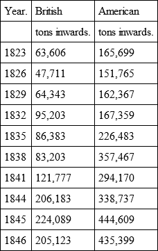 Thus it appears that under the reciprocity system with some countries since 1823, and free trade in shipping with all in 1847, the foreign shipping employed in carrying on the British trade had so rapidly grown upon the British, that, while at the commencement of the period the British stood to the foreign as 174 to 58, or 3 to 1 exactly, at the close they stood as 49 to 22, or somewhat above 2 to 1 only. And observe the vast start of foreign shipping as compared with British, since free trade was introduced by Sir R. Peel in 1846. For while the British tonnage was to the foreign in 1845 as 43 to 17, or as 21⁄2 to 1; in the year 1847 it was as 49 to 229, or 21⁄3 to 1 only. So rapid has been the growth of foreign shipping over British in eighteen months of general free trade. In ten years of such a system, it is easy to see that the foreign tonnage employed in carrying on our trade will be equal to the British; and then our national independence is gone for ever, for we have nursed up in our harbours a body of foreign seamen equal to our own.