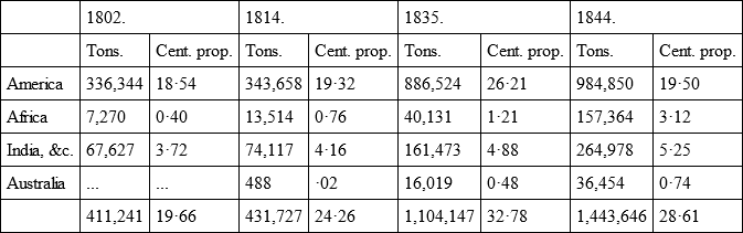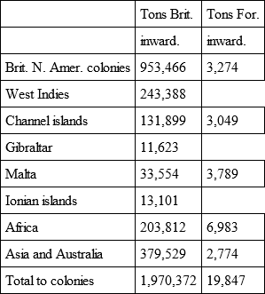 Thus the British trade to our colonial settlements is about a hundred times the foreign, and constitutes nearly a third of the whole tonnage employed in carrying on our commerce, and about two-fifths of the total British tonnage, – (1,970,372 out of 4,942,094.)
