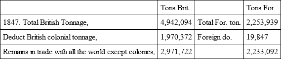 So that, setting aside our colonial trade, the British tonnage is to the tonnage with all the rest of the world as 29 to 22, or as 4 to 3 only! Considering the rapid strides which, under the reciprocity system established only with a limited number of countries in 1823, the foreign shipping is making in encroachment upon the British, this fact affords room for the most serious reflections. It is clear, from the great advance of foreign over British shipping in the single year of temporary suspension of the Navigation Laws, under the pressure of famine in 1847 – viz. from 1,735,679, to 2,253,979; while the British in the same period advanced only from 4,310,639, to 4,942,094, – that two or three years of free trade in shipping will bring the foreign vessels employed in conducting our trade, exclusive of those engaged in the colonial, to an equality with the British. The moment that period arrives, our maritime superiority, and with it our national independence, hang entirely on our colonial trade, which, and which alone, strikes the balance at present in our favour. And yet, the colonial trade is the precise thing which it is the object of the repeal of the Navigation Laws to throw open to foreign nations! In their anxiety to cheapen every thing, the Free-traders would gladly expose our shipping interest engaged in the colonial trade to the same competition, which has already proved so disastrous to that part of it which is engaged in the traffic with foreign nations.