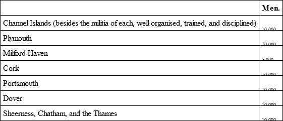 The whole force employed at home in Great Britain and Ireland would not afford a sufficient number of men for the mere defence and occupation, on the breaking out of a war, of the works constructed for the defence of the dockyards and naval arsenals, without leaving a single man disposable.