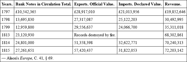 "If the price of corn were to fall to 50s. a quarter, and labour and other commodities nearly in proportion, there can be no doubt that the stockholder would be benefited unfairly at the expense of the industrious classes of society. During the twenty years, beginning with 1794, and ending with 1813, the average price of wheat was about 83s.; during ten years, ending with 1813, 92s.; and during the last five years of this same twenty, the price was 108s. In the course of these twenty years, government borrowed near £500,000,000 of real capital, exclusive of the sinking fund, at the rate of about five per cent interest. But if corn shall fall to 50s. a quarter, and other commodities in proportion, instead of an interest of five per cent., the government will really pay an interest of seven, eight, and nine, and for the last £200,000,000, of ten per cent. This must be paid by the industrious classes of society, and by the landlords; that is, by all those whose nominal incomes vary with the variations in the measure of value; and if we completely succeed in the reduction of the price of corn and labour, this increased interest must be paid in future from a revenue of about half the nominal value of the national income in 1813. If we consider with what an increased weight the taxes on tea, sugar, malt, soap, candles, &c., would in this case bear on the labouring classes of society, and what proportion of their income all the active, industrious middle orders of the state, as well as the higher orders, must pay, in assessed taxes and the various articles of custom and excise, the pressure will appear to be absolutely intolerable. Indeed, if the measure of value were really to fall as we have supposed, there is great reason to fear that the country would be absolutely unable to continue the payment of the present interest of the national debt." —Malthus's Essays.