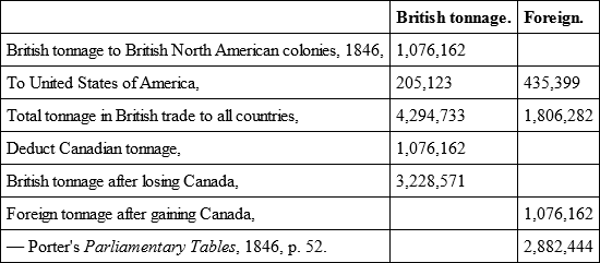 The repeal of the Navigation Laws in 1847 gave such an impulse to foreign shipping, that, in the first year after the loss of Canada, the foreign shipping employed in our trade would exceed the British, even supposing we only lost two-thirds of Canadian trade by its independence.