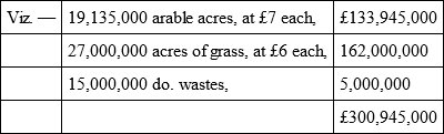 The mortgages of England alone are estimated, by the best authorities, at £400,000,000. Those of Ireland and Scotland are certainly at least half as much more, or £200,000,000. Indeed, out of the rental of £14,000,000 a-year, now in part become nominal in the former country, it is usually reckoned that £10,000,000 go to the holders of mortgages.