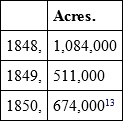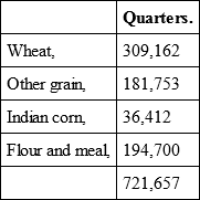 The first is the extraordinary and appalling increase which, since Free Trade was introduced, has taken place in the proportion of the daily food of our population which is furnished by foreign states. Before the great change in our policy began, the nation had been rendered, practically speaking, self-supporting. The importation of wheat, for the five years from 1830 to 1835, was only 398,000 quarters; and even during the five bad years in succession, from 1836 to 1841, the average importation was only 1,700,000 quarters. From 1830 to 1840, the average importation of wheat and flour was only 907,000 quarters.10 But since the great change of 1846, the state of matters has been so completely changed that it is now notorious that, in ordinary years, the importations cannot be expected to be ever less than 9,000,000 or 10,000,000 quarters of grain, about 5,000,000 quarters of which consists of wheat.11 The importation in the single month of July last, in the face of prices about 42s. the quarter, was no less than 1,700,000 quarters of all sorts of grain;12 and in the month ending November 5, with prices about 39s. 9d. the quarter of wheat, the importation was: —