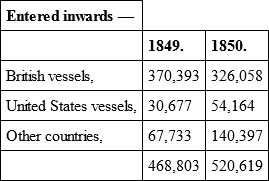 "In the year 1840, the total amount of tonnage entered inwards, in the foreign trade of the United Kingdom, was 4,105,207 tons, of which 2,307,367 were British, and 1,297,840 foreign. In 1845, the British tonnage had advanced to 3,669,853, and the foreign to 1,353,735, making an aggregate of 5,023,588 tons. In 1849, the British entries were 4,390,375, the foreign 1,680,894 – together 6,071,269 tons. Thus, in ten years, with a growing commerce, but under protection, British tonnage had progressively increased 1,583,008 tons, or 56-1/3 per cent.; and foreign 383,054 tons, or 29½ per cent. At this point, protection was withdrawn. Free navigation has now been ten months in operation, and the following is the result: —