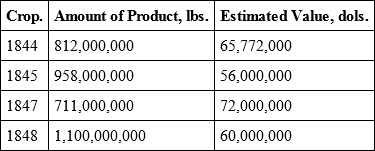 There is, however, no such thing as a universal code of political economy. The Americans listened and laughed, and ran up their factories faster than ever, and ransacked the bowels of the earth for their inestimable strata of minerals, believing with a proper faith that they would not have been placed there unless it was intended that man should convert them to his use. Our cotton manufacturers, being thus situated, had some reason to despond. The nation that gave them their raw material, and that was also their best customer for fabrics, seemed on the very point of deserting them in both ways. True, a much greater quantity of cotton than was ever yet grown might be raised in America, but then the demand, though great in itself, has limits; and an unusually large crop has the effect of extinguishing profit to the grower. This will be better understood by the American estimate of the value of crops: —