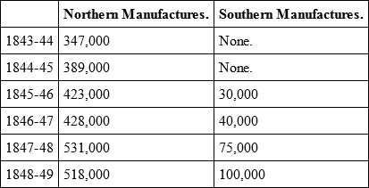 The estimate for the latter year, says Mr Carey, was that made at New Orleans before the occurrence of the frosts and freshets, which, we presume, raised the price of cotton wool. We see, however, from this, that the small yield of 1847 was infinitely more profitable to the grower than the large yield of 1845, and this will explain the reason why the culture of cotton cannot be indefinitely extended. It therefore became necessary, at all hazards, if cotton-spinning in Britain was to be maintained in its former palmy state, that some further concession should be made to America, to bribe her, since she could not be forced to abstain from the encouragement of her own manufactures.