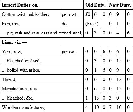 Among these we are surely entitled to reckon Switzerland and Germany – including in the latter denomination that powerful confederacy, the Zollverein, which embraces the Hanseatic towns. These are Protectionist – determined at all hazards to maintain their doctrine of fostering native industry, and meeting us, not with reciprocity, but with augmented customs' duties. The following extracts from the last modifications of the general tariff of the Zollverein may be instructive: —