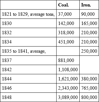 Is this a bold or unauthorised assertion? Let us see. Who has forgotten the prophecies, or rather the confident assumption, of that entire and unlimited reciprocity which was to prevail between Great Britain and America, the moment after the former power announced her intention of admitting free of import duties the produce of the latter? Certainly we have not, though the memories of many people in Manchester and the adjacent parts may be more fallacious. In common fairness we must allow that, so far as argument could be drawn from mere hypothesis, the advocates of Free Trade were entitled to make the most of America. No other country could afford them so plausible a plea for reciprocity. Through absolute necessity, the cotton manufacturers of Great Britain depended upon America for their yearly supply of raw material. America hitherto had taken a large proportion of our manufactured goods – being content that the cotton, before it reached her in a textile fabric, should twice cross the waters of the Atlantic; and she also was a large customer for our coal, our iron, and other commodities. The terms were still unequal, at least for endurance. Britain could not do – at least Manchester and its dependencies could not – without the supply of cotton wool; but how if America, by rearing factories and furnaces, could contrive to do without either our calicoes, or our coal, or our iron? For a long time it was supposed that this was impossible – that the Americans had not sufficient capital to embark in manufacturing pursuits – and that nature had denied them those plentiful stores of coal and iron which are to be found in the British islands. The following tables, brought down to the latest accessible dates, will demonstrate the fallacy of that idea: —