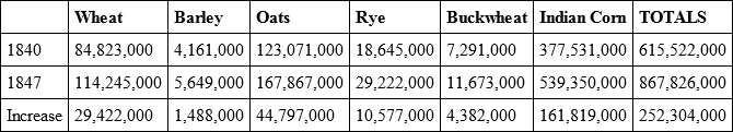 One word as to the prospects of the British farmer. We know from undoubted authority that in many parts of the United States, for example Ottawa, excellent land may be purchased for £1 an acre, broken up for 7s., burdened by no poor nor county rates, and unconscious of the presence of the tax-gatherer. Land such as this can, indeed, afford to produce corn at an almost nominal price – ballast for the ships that shall bring back the overweighted and ruined yeomen and peasants of England to New York and New Orleans! But, vast as the immigration has been, the production of food has greatly outstripped it; and as fresh tracts of virgin land are, year by year, brought into cultivation, and internal communications opened or improved, we see no reason whatever to believe that the export of grain to England will diminish, or the price of that grain be enhanced. Let our readers bear in mind the wonderful development of the mining and manufacturing resources of America, to which we have just directed their attention, and then see how, in spite of, or far rather concurrently with that, the production of food also increased. We again quote from The Harmony of Interests. How great was the increase may be seen by the following comparison of the returns under the census of 1840, and the Patent Office Estimates for 1847: —
